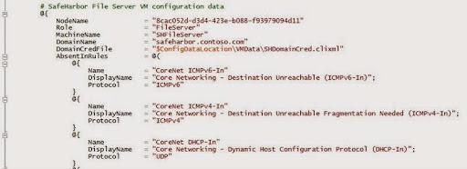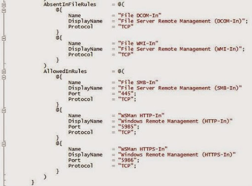 Here is a snippet of the configuration data used on the fileserver. Only smb and powershell remoting traffic is allowed and all other ports and rules are locked down. This ensures that the workload servers are secured completely.