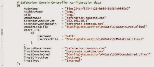 The same configuration which was used to setup the Corporate DC (see previous section) is used here. However the manifest data is different. Apart from using secure way of managing credentials, the key take away here is that we create a new domain user MATA (Management Account for Trusted Action). This is a non-admin user which is restricted to be used only on the workload File Servers to perform specific actions. There is also a one-way trust established to the Corporate domain to enable authenticating users from the Corporate domain.